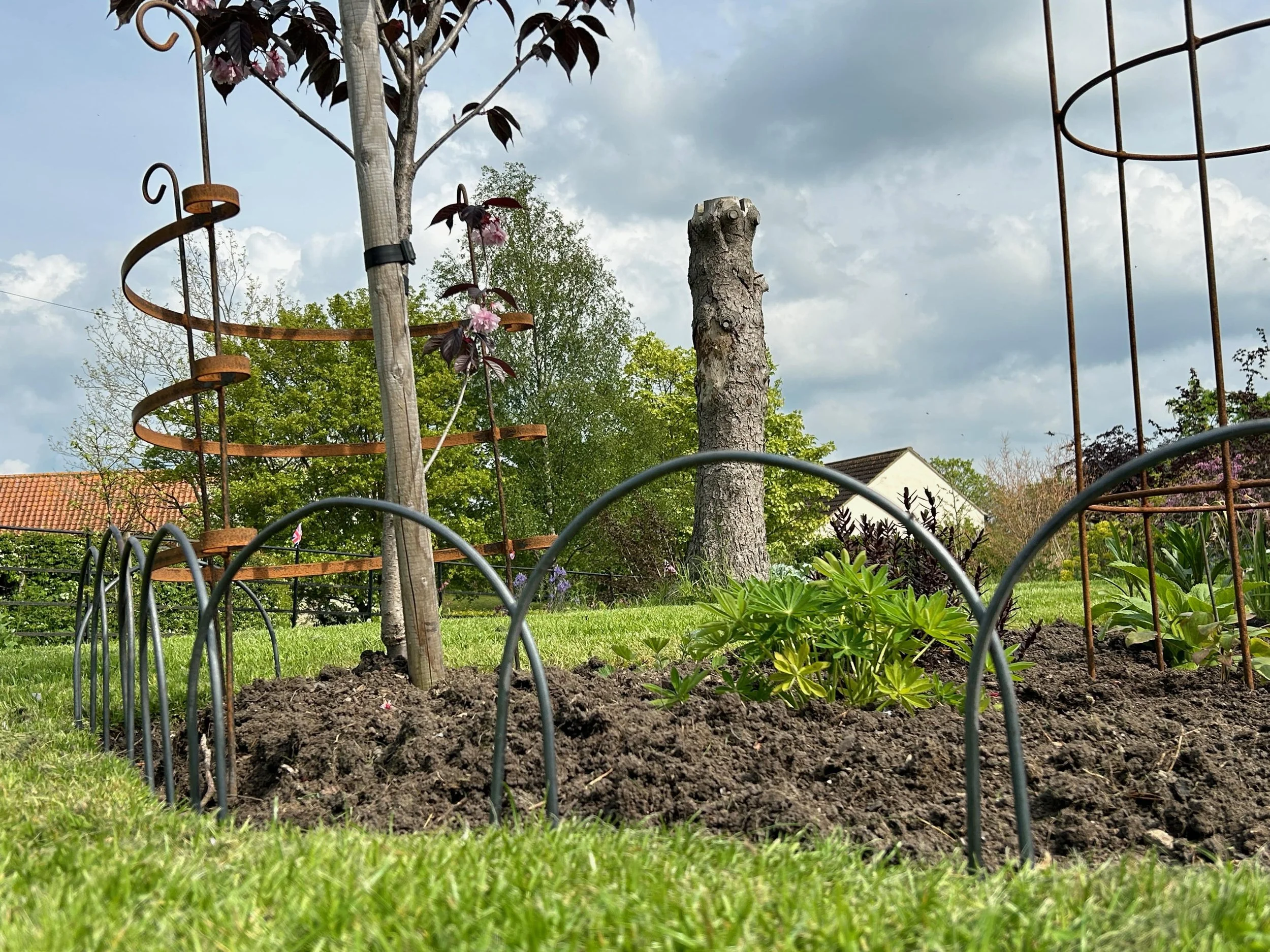 The edging hoops supplied by us at Lincolnshire Plant Supports Ltd are made from 8mm solid steel, chosen for its strength, weight and long service life. Each hoop is hand bent by us in Lincolnshire, ensuring consistency of shape and a robust finish that will stand up to years of use in the garden. They are supplied uncoated, allowing the steel to develop a natural rusted patina over time. This soft, weathered finish blends effortlessly into soil, stone and planting, avoiding the harshness of painted or plastic alternatives and becoming more attractive with age.